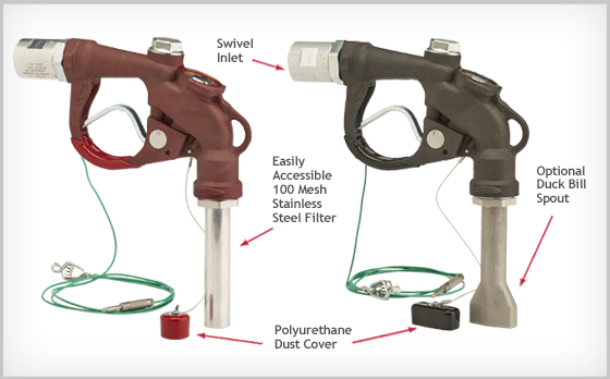 The new Falcon line of manual nozzles, available from Hewitt, is specifically designed for business and private over-the-wing aviation fueling. Falcon comes with two spout-designs. One option features screw-in spouts. The other option features quick-disconnect spouts for easy checking of the 100-mesh filter or for applications where one must change from the duck bill spout to a round spout as is the case for helicopter fueling.