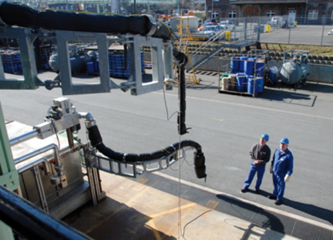 Moving large volumes of liquid chemicals is a demanding task that must be accomplished quickly and efficiently. But above all: Safely. It represents the life blood for chemical and pharmaceutical companies, which require loading systems to transfer their important products to customers in the safest manner possible. For example what is the best way to load phenol, or carbolic acid, for transport by railcars to customers? One solution is to install a single RS Liquid Loading Arm, capable of moving 180 degrees so it can top-load two side-by-side railcars using a single hose assembly.
